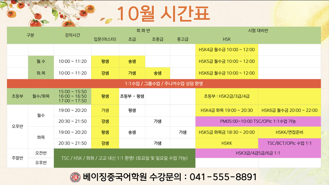 10월 신규수강생의 경우 레벨테스트 후 ‘신규 개강반’ 또는 ‘기존 수업 진행반’ 中선택