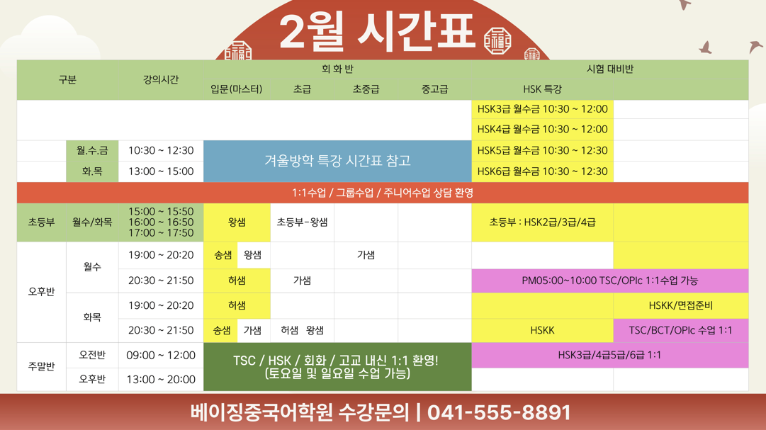 2월 신규수강생의 경우 레벨테스트 후 ‘신규 개강반’ 또는 ‘기존 수업 진행반’ 中선택