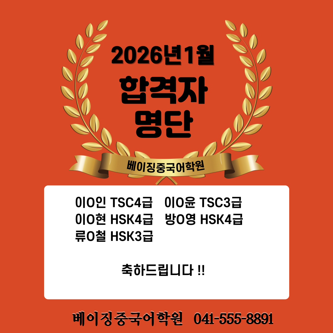 TSC4급: 1:1수업 12시간 수강 후 취득 TSC3급: 1:1수업 16시간 수강 후 취득 HSK4급: 정규반 주2회 2개월 수강 후 취득 HSK3급: 정규반 주2회 1.5개월 수강 후 취득 진심으로 축하드립니다! [이 게시물은 최고관리자님에 의해 2026-02-11 20:16:43 보도자료에서 복사 됨]